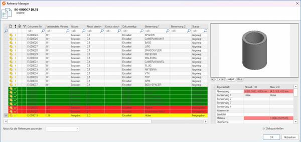 - Aktualisierung einzelner Referenzen auf die aktuelle oder freigegebene Version über das Aktionsfeld
