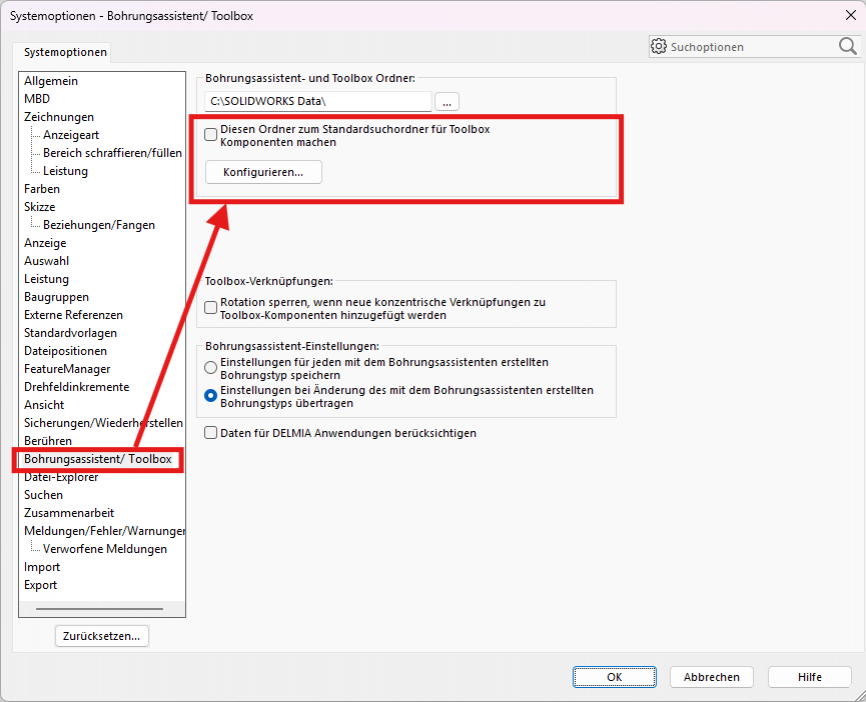| solidworks.toolboxpartfolder | Definiert das Basisverzeichnis der Toolboxteile |