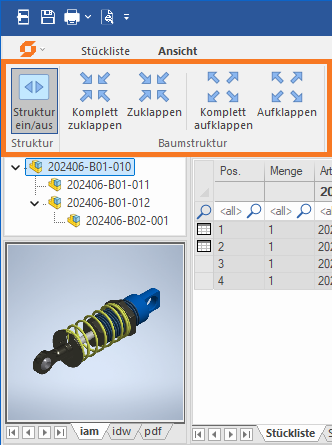Über den Reiter „Ansicht“ lassen sich Strukturbereich und Vorschaufenster ein- oder ausblenden. Die Funktionen „Auf- und Zuklappen“ stehen nur dann zur Verfügung, wenn die ausgewählte Baugruppe eine Struktur mit Unterbaugruppen enthält.