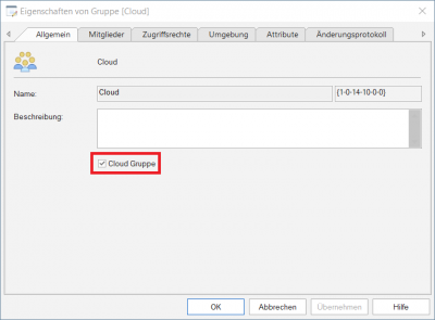 Um eine Gruppe Cloud-fähig zu machen und ihr User hinzufügen zu können muss der Cloud-Schalter in der Gruppe gesetzt werden.
