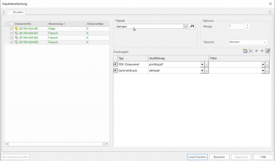 Die zu druckenden Dateien werden bestimmt durch Auswahl der Dokumente, der Baugruppen oder eines Ordners. Bei Baugruppen werden alle Referenzierten Teile automatisch ausgewählt.
