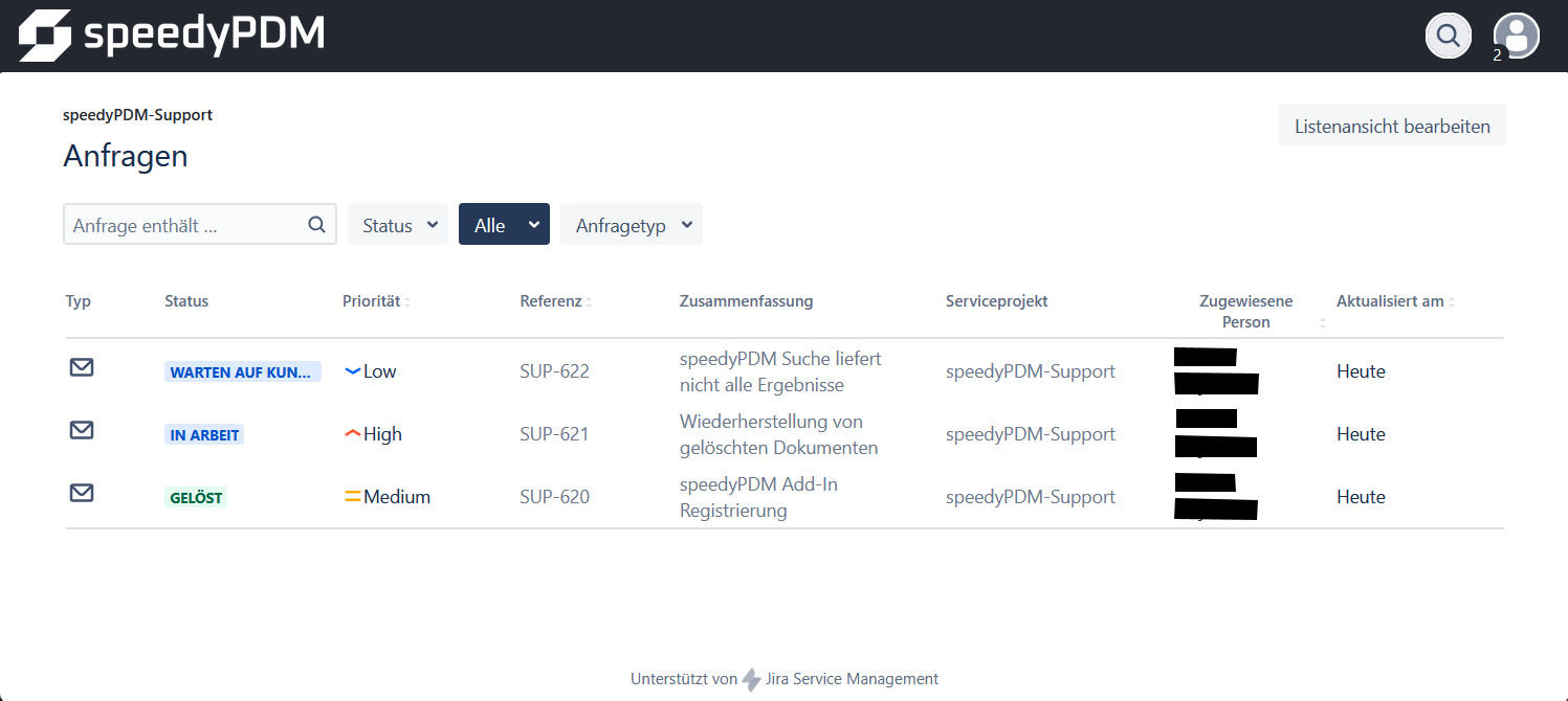 Sie befinden sich hier: Produkt Daten Management ** made in germany ** made with experience ** » speedy » FAQ » Support : ticketuebersicht.png